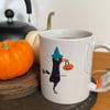 Hazel (the Halloween bird) is dressed up as a witch with her familiar black cat (kinda ironic, right?) posing for a picture before heading out to trick or treat on this cute mug.